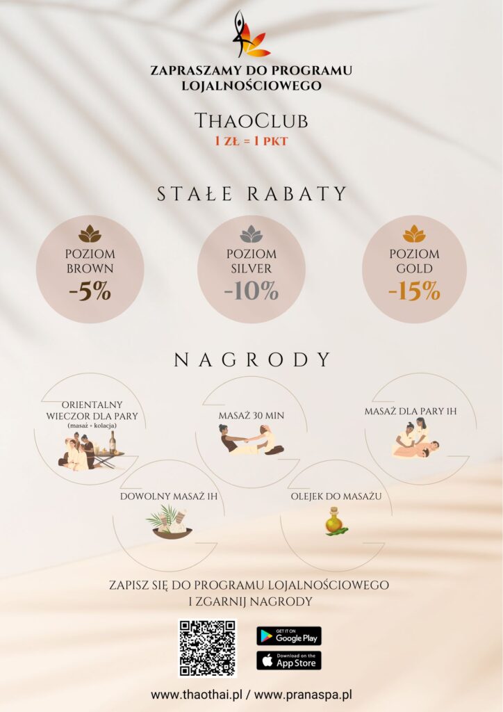 Jest to program lojalnościowy, w którym goście salonów Prana Spa i Thao Thai będą mogli zbierać punkty za wykonywane masaże i zabiegi oraz wymieniać je na nagrody! Dodatkowo otrzymuje się stały rabat w wysokości 5%, 10% lub 15%. Rabat przyznawany jest w zależności od ilości uzbieranych punktów, natomiast – 5% otrzymuje się tuż po rejestracji do programu Thao Club.